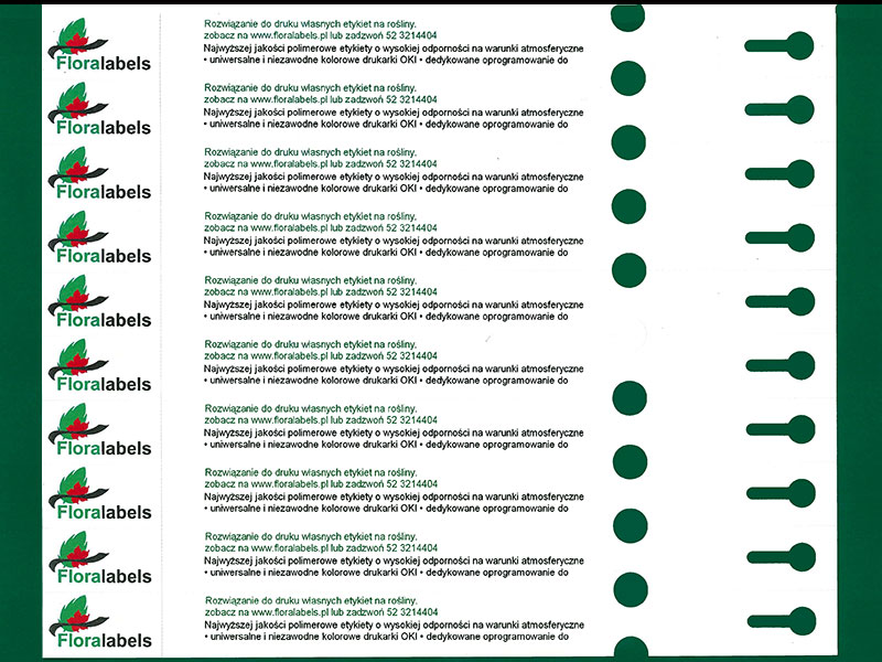 Najwyższej jakości etykiety o wyraźnych i trwałych kolorach zadruku, miękkie i łatwe w oddzielaniu. Wersja z oddzieralną końcówką. Opis materiałów: http://floralabels.pl/rodzaje-materialow/