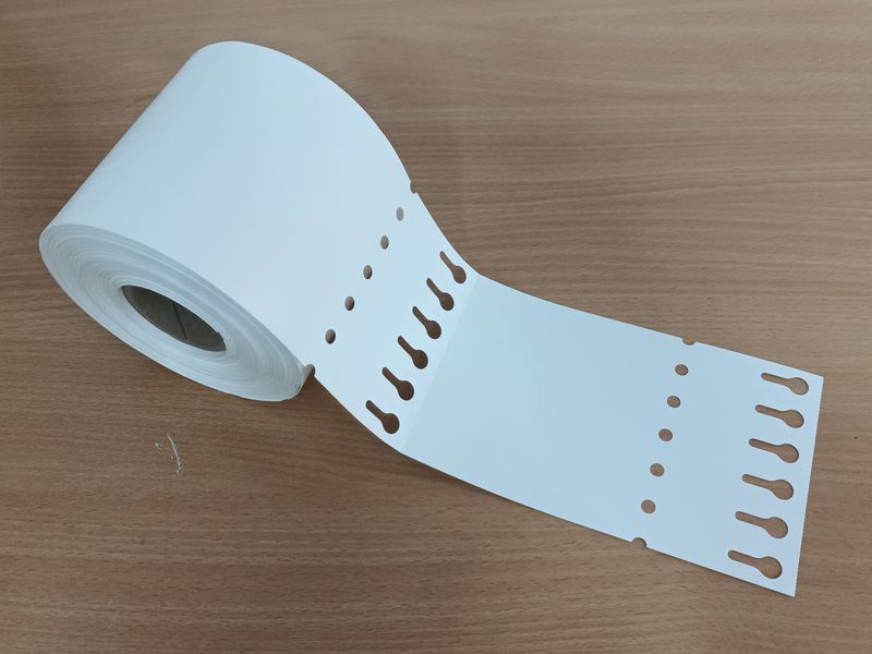 Etykiety w rolkach  na gilzie 4cm, przeznaczone do zadruku na drukarkach termotransferowych nabiurkowych i przemysłowych, w których fotokomórka - czujnik odstępu etykiet nie może być umieszczony na stałe, powinien być przesuwny, tak by go umieścić w odpowiednim miejscu. Aby wydruk był trwały należy używać taśm/folii żywicznych.