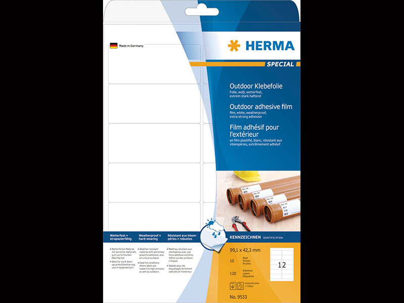 Odporne na warunki atmosferyczne, słońce, rozdarcia, trwałe, nie wchodzą w reakcję z wodą, olejem i brudem. Zmywalne wodą, benzyną, alkoholem. Zachowują swoje właściwości w temperaturach od -40 do +150°C. Idealne na zewnątrz: na tabliczki informacyjne, do oznaczania budynków, okien, jako znaki informacyjne i ostrzegawcze, tabliczki znamionowe, do zastosowań w produkcji i magazynach, ekstremalnie mocno przylegające.